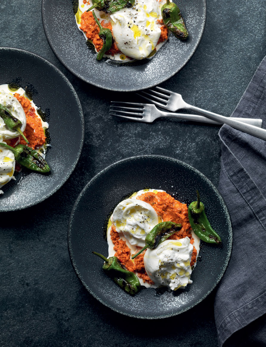 BURRATA WITH ROMESCO SAUCE AND GRILLED PADRON PEPPERS