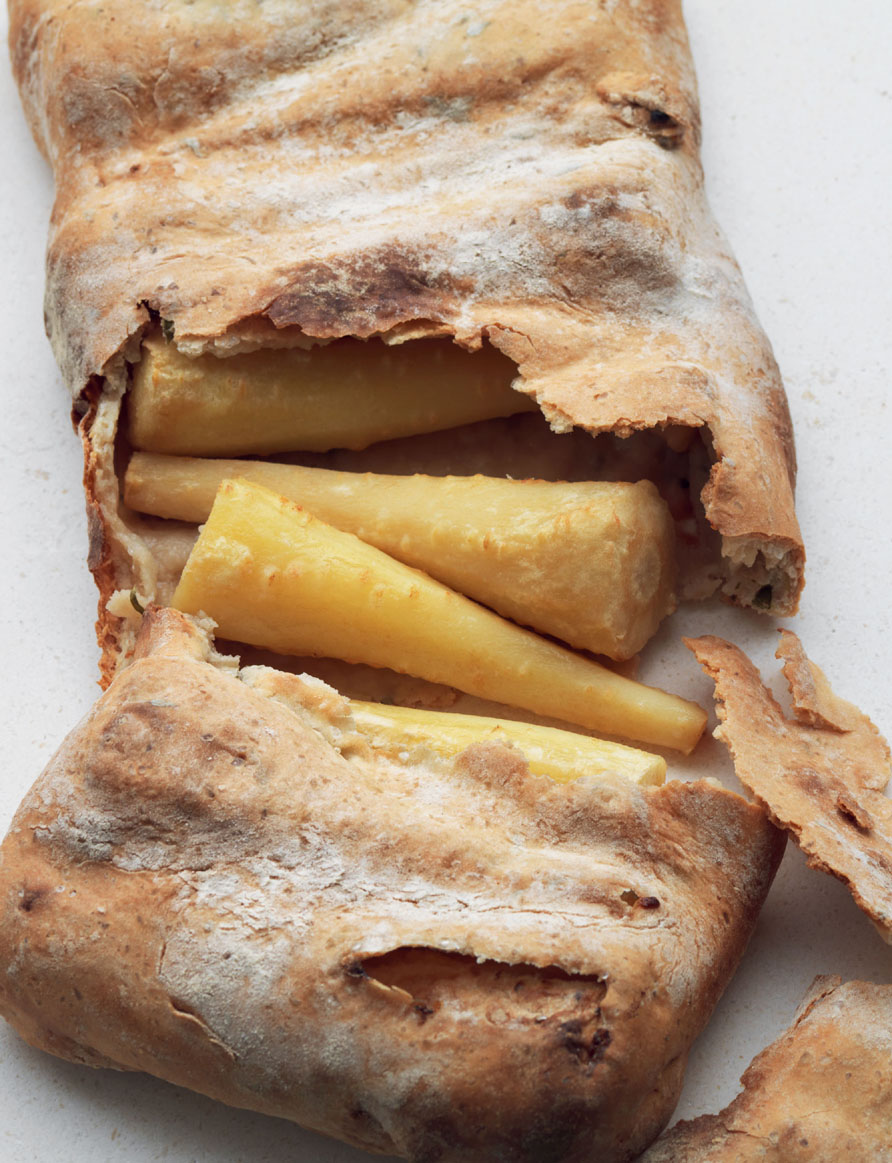 To make the salt dough, combine all ingredients in a bowl with 100–125ml cold water (enough to bind the mixture). Knead until well combined. Roll out the dough on a sheet of baking parchment to a thickness of 2mm, then place the parsnips, top to tail, on top. Fold the dough on top of the parsnips until the parsnips are completely enclosed and place the dough-wrapped parsnips on a baking sheet. Bake for 1 hour until the parsnips are soft (breaking the crust a little to test for doneness with a knife).