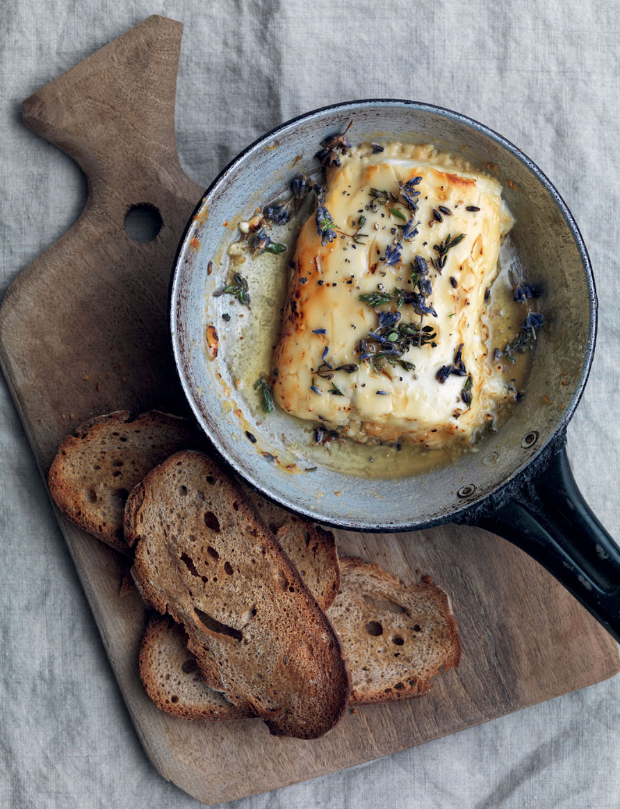 HONEY-BAKED FETA WITH LAVENDER, THYME AND RYE CRISPS