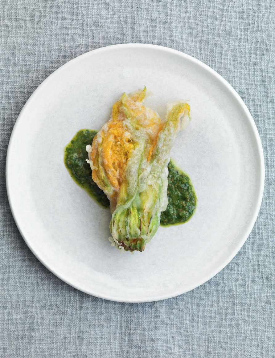 Courgette flowers are another of those wondrous ingredients that signal the arrival of warmer weather. Not much needs doing to them as they are perfect simply fried in a little oil and served with this sauce. Choose the flowers that are large and firm, as they can accommodate more stuffing and will retain their shape better when cooked.