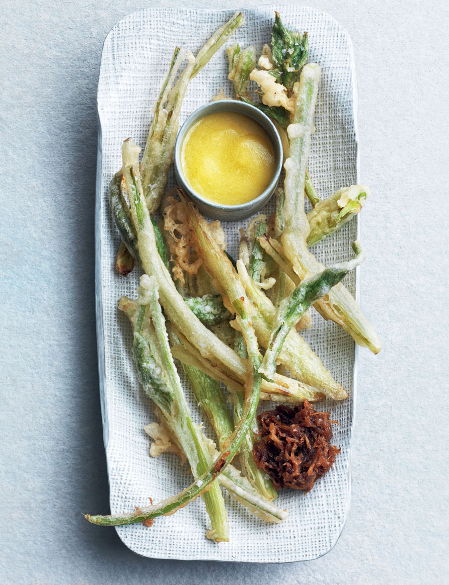 Tempura is always a treat but generally it is reserved for fish or seafood. This recipe uses fennel, which has a lovely flavour when it’s effectively ‘steamed’ in the light, crisp batter. In this recipe, there are also two other unusual elements – a fennel ‘marmalade’ whereby the fennel is caramelised and releases its own sugars to create a sweet condiment, and a vegan aioli made with chickpea water.