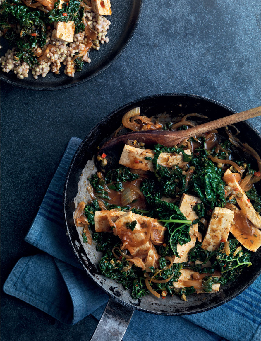 Spoon the buckwheat into bowls then top it with the braised tofu, cavolo nero and caper sauce.