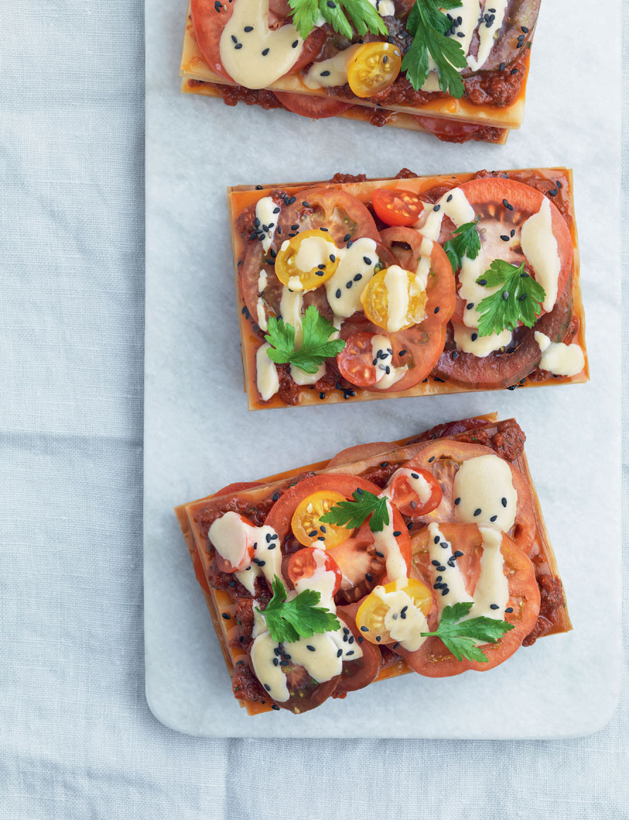 This is the perfect dish for an impressive but light summer lunch, when tomatoes are at their finest and the rosé is flowing. Filo pastry is a versatile product to always have in the fridge, given it can be used for sweet and savoury dishes and is rather quick to cook. It’s dairy-free and egg-free, too.