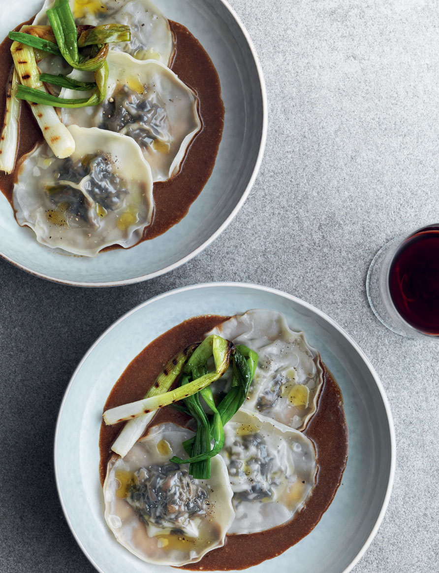 MUSHROOM ‘RAVIOLI’ WITH SHALLOT SAUCE AND GRILLED SPRING ONIONS