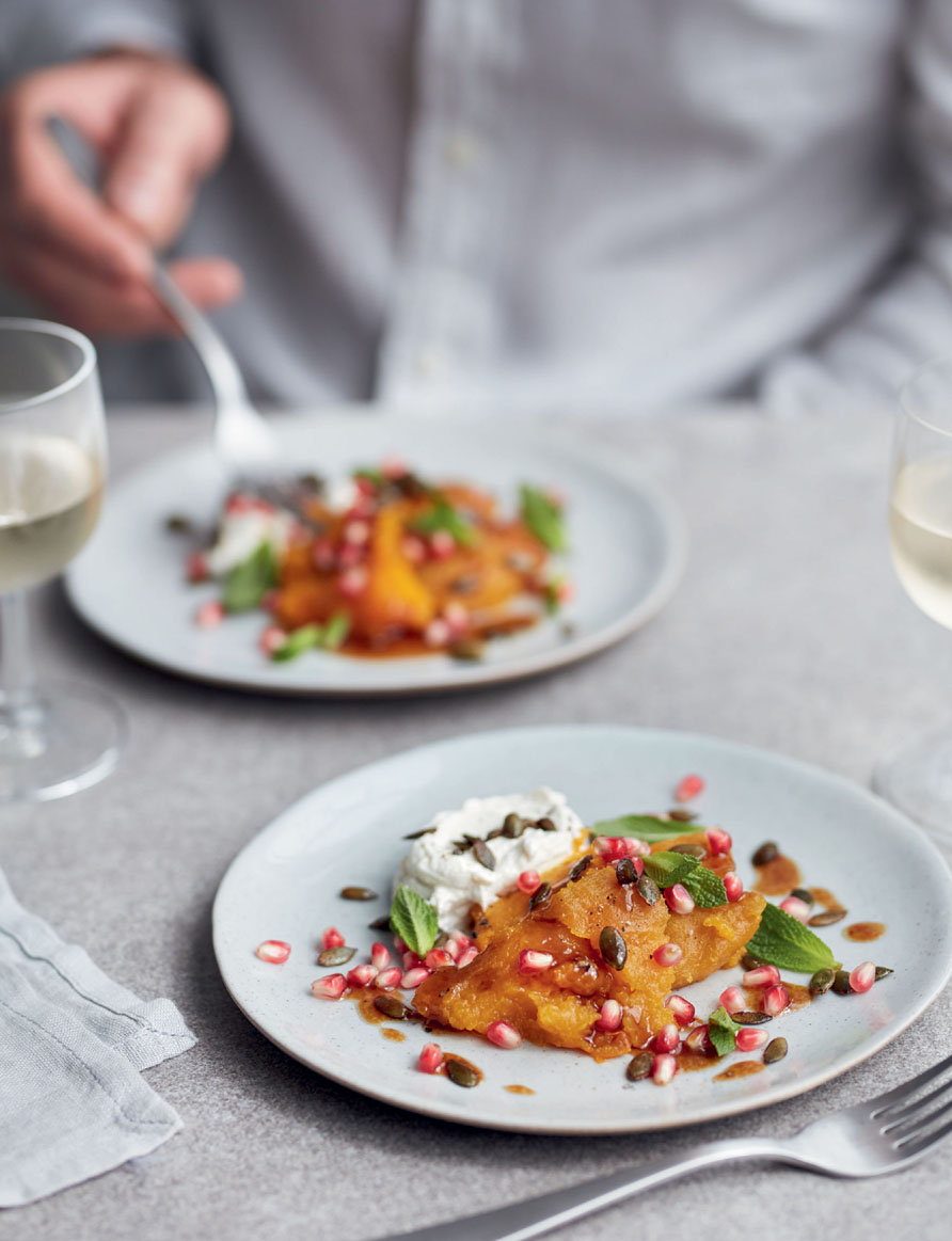 Add the nutmeg and 25g of the butter and lightly mash the squash. Season to taste and keep warm.