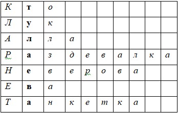 Теперь нужно правильно выстроить в кроссворде слова: Алла, Ева, кларнет, кто, лук, Неверова, танкетка.