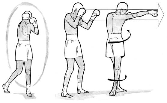 While doing this punch, the boxer raises lead elbow up so that the fist is moving almost along a spiral trajectory. As a result, left hand of the opponent will be parried with a lead shoulder or a forearm if he strikes.