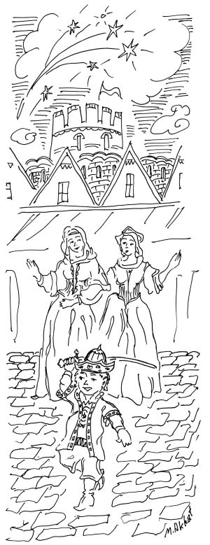 Мальчик ни слова не понял из того, что говорили женщины, но глядел на фрейлин королевы широко распахнутыми глазами. Они казались ему волшебными красавицами, блистающими нарядами и драгоценностями. Женщины склонялись над ним, теребили его, щипали за щёчки, а одна, наклонившись совсем близко, обдала запахом духов и крепко поцеловала в губы. Мальчик испуганно отпрянул от фрейлины, а та весело рассмеялась: