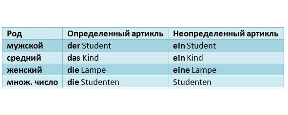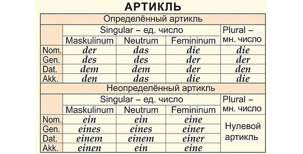 Артикль имеется определённый der-das-die, неопределенный ein-ein-eine. Неопределённый используется, когда объект называется в первый раз, определённый когда во второй, а также при веществах, порциях.