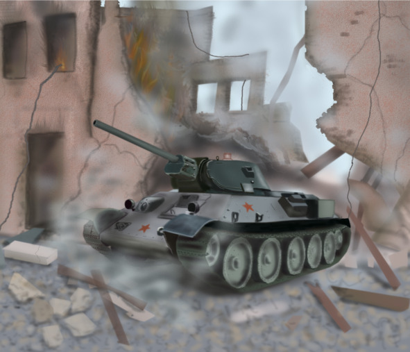 Тридцатьчетвёрка содрогнулась от близкого взрыва. Смотровую щель полностью закрыл ливень из каких-то обломков и комьев земли. Командир приподнялся, пытаясь осмотреться. Грянул второй взрыв. Создавалось ощущение, что по танку поддали огромной кувалдой по днищу. Машина и её экипаж были ещё живы и стальной зверь, развернувшись на вражеской траншее, грохнул залпом своего орудия. Ближний бункер, возле которого словно медведя обложили немецкие солдаты наш Т-34, треснул почти пополам от прямого попадания заряда. Тридцатьчетвёрка рванула вперёд, но один из германцев, вынырнувший откуда-то снизу, пропихнул под правую гусеницу здоровенный, похожий на каравай кругляк мины и побежал прочь. Пулемётная очередь переломила солдата пополам. Грянул взрыв. Стальной зверь, получив тяжелейшее ранение, тем не менее, был жив и продолжал сражаться. Экипаж вёл пулемётный огонь по едва различимым в дыму позициям врага. Атака немцев, похоже, захлебнулась, и экипаж, обездвиженный в своей боевой машине, продолжал вести бой, надеясь на идущее следом подкрепление. Развалины, находившиеся примерно в пятидесяти метрах от танка, походили на разбитый вдребезги кувшин с чудом уцелевшим донышком. Расчет солдат в камуфлированных маскхалатах тихонько выставил в пролом стены ствол крохотной, почти игрушечной пушки. На её стволе виднелась шишка надкалиберного снаряда. Тридцатьчетвёрка разворачивала башню вправо, когда крохотное орудие выплюнуло свой заряд по противнику [1]. Грохнул сильнейший взрыв. Вспышка ослепила механика-водителя танка. Жуткая боль, внезапная ослепительная вспышка, разрезавшая темноту пополам, крики горящих заживо товарищей и мгновенная темнота и тишина.