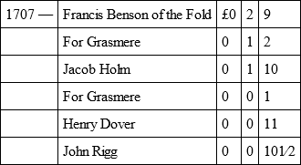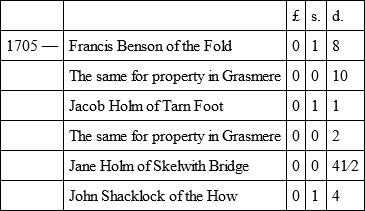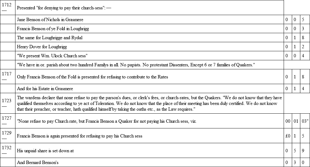 After the law-suit concerning the tithes, which followed upon the Restoration (see ante), in which law-suit Francis Benson was concerned, and possibly other Quakers, we have no evidence as to whether the sect continued to oppose the payment of church scot. But there is abundant evidence to show that they were resolute in non-attendance at church, and in refusal to pay the church rate or "sess" levied on the townships for the upkeep of the fabric and its walls by the representative men of the parish. The Subsidy Rolls of 1675 show that Francis Benson paid for himself and his wife Dorothy the tax of 1s. 4d., which the Government demanded from all non-communicants, as did "Reynald" Holme for self and wife, and John Benson of Langdale.