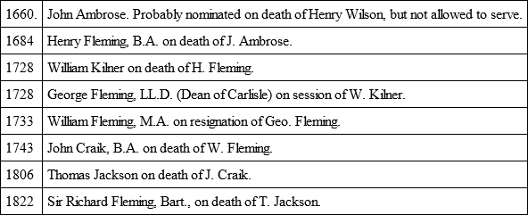 Master Hugh Ashton, parson, acted as Receiver-general for the lands of the Countess of Richmond (the Lindesay Fee) in 1505-6.92 On his resignation in 1511, Henry VIII. exercised his right as inheritor of the Fee, and nominated John Frost to the rectory; the abbot and convent presenting in due form. This happened again in 1525, when William Holgill was appointed.93