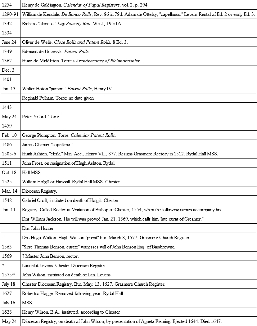 It has been seen that the parson of the parish was a pluralist and a non-resident as early as 1254; and so were those of his successors of whom we have evidence. The glimpses obtained through scant record disclose the tithe-taking rector of the valley as a figure distinguished by education, if not by family, and known to the lofty in station. He is termed "Master," and bears the suffix "clerk"; while "Sir" is reserved for the curate, his deputy, who has not graduated at either university.86 He was skilled in law more than in theology. He may have served an apprenticeship in the great office of the Chancery; sometimes men of his position are termed "king's clerk."87 He was not an idle man, and was often employed in secular business by the lord of the Fee. It may have been in the collection of the lady's dues – for the heiress Christiana de Lindesay, had married Ingelram de Gynes, of Coucy in France, in 1283 – that the parson of Grasmere suffered an assault (1290) at Leghton Gynes (later Leighton Conyers). It is certain that when Robert de Gynes, one of the sons of Christiana, and possessed of some of her lands about Casterton and Levens, went "beyond the seas" in 1334, he empowered Oliver de Welle, parson of Grasmere, to act with Thomas de Bethum as his attorney. Oliver de Welle had a footing in our valleys besides his parsonage, for he is stated to have held, under the lord William de Coucy, deceased, "a certain place called Little Langedon in Stirkland Ketle," which was then (1352) in the custody of the executor of his will, John de Crofte.88