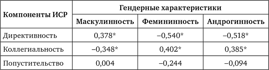 Повышение маскулинности личности приводит к усилению директивности стиля руководства, и наоборот, развитие коллегиального компонента ИСР связано с усилением фемининных и андрогинных качеств и ослаблением маскулинных черт личности руководителей. Обращает на себя внимание отсутствие прямых, однозначных связей между характеристиками психологического пола и формированием попустительского компонента стиля руководства.