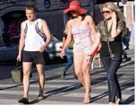 Поскольку реакция на температуру у каждого своя, то в одной компании рядом могут идти обнаженный практически до трусов (или шортов длиной с трусы) и одетый в футболку с рукавами и плотные брюки.