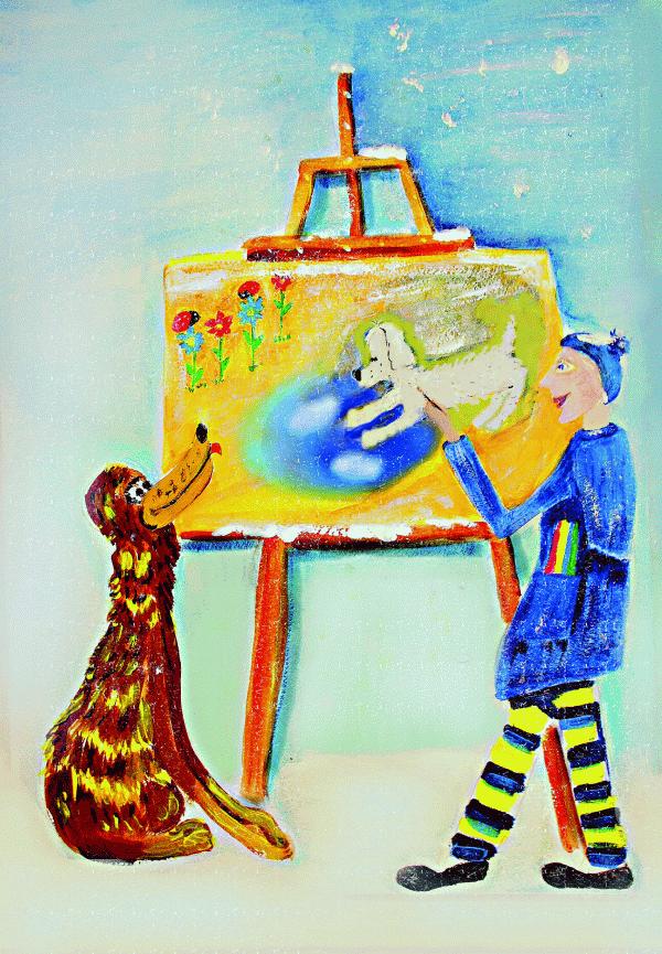 Мне старший брат купил мольберт.И мной забыт велосипед.Беру большой квадратный лист.В руке моей зажата кисть.Белеет лист сухим пятном.Зима лютует за окном.С водой смешаю акварель.И на листе шалун-апрельСосульки острые свои,Как шпаги, выставил… смотри!Мазок – зелёная карета,И на бумаге вспыхнет лето,Сверкает, пенится, жужжит…Легко мне с красками дружить!Я красный цвет беру в коробке,Повсюду божии коровки,Как праздничные огоньки,Садятся прямо на цветки.Вот дождь пролился на бумагу,И все дворовые собакиЛохматые, смешные мордыМакают в лужи-небосводы…