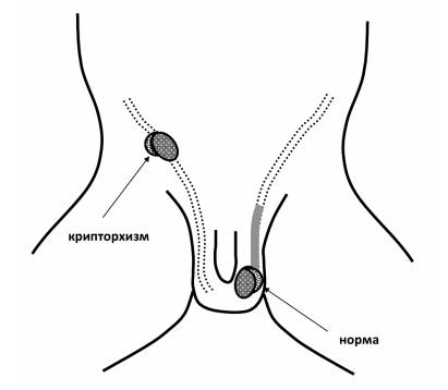 Если этого не произошло, и у мальчика одно или оба яичка расположены в брюшной полости либо в паховом канале, устанавливается диагноз «крипторхизм» (рис. 11), что требует проведения вмешательства. Также отклонением от нормы является состояние, при котором яички периодически поднимаются из мошонки в брюшную полость либо в область лона. В этом случае нужно обратиться к врачу.