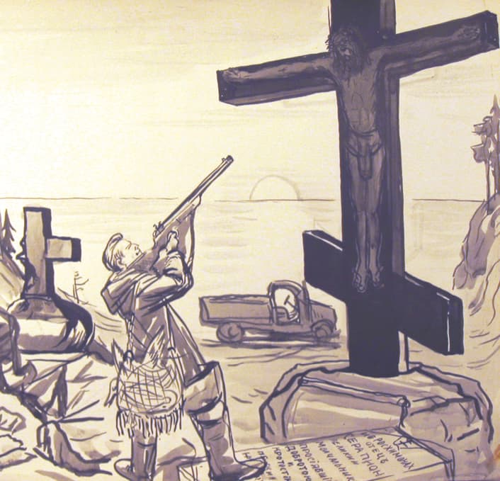 А когда я приехал туда в 74 году, то я застал, как говорится, мерзость запустения. От центрального монастыря через весь остров к противоположному берегу шла дорога. И вдоль неё на левой стороне расположилось большое кладбище. Стояли удивительные часовни, возвышались кресты из розового мрамора, из красного, из чёрного, из белого мрамора, а на дороге валялся длинный холст, на котором изображалось распятие с ликом Христа. Куда-то его тащили, бедного Христа, и бросили посреди дороги. Тут дождь лил, ветер его трепал, он весь извивался, этот холст, – так там обращались с последними остатками христианского убранства. И это ужасало. Но я приехал смотреть не на это, хотя и не видеть этого было невозможно. Я хотел поскорее увидеть инвалидов войны.