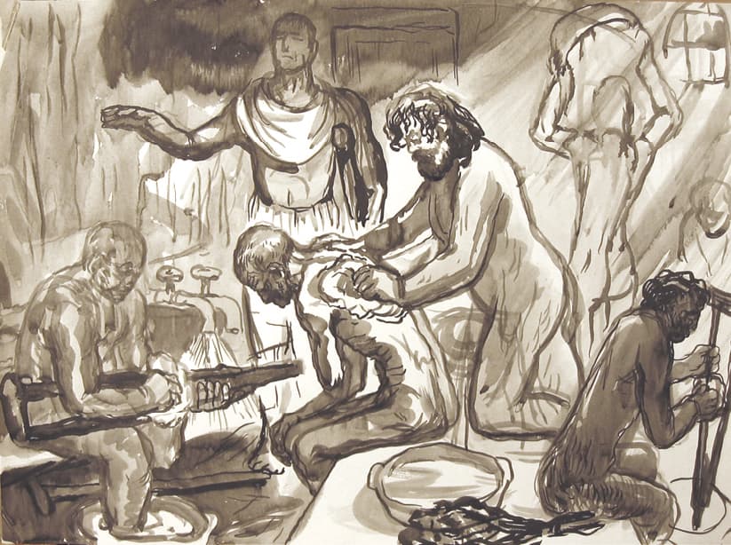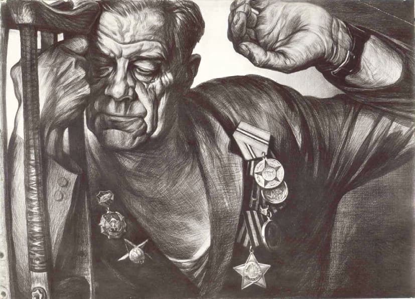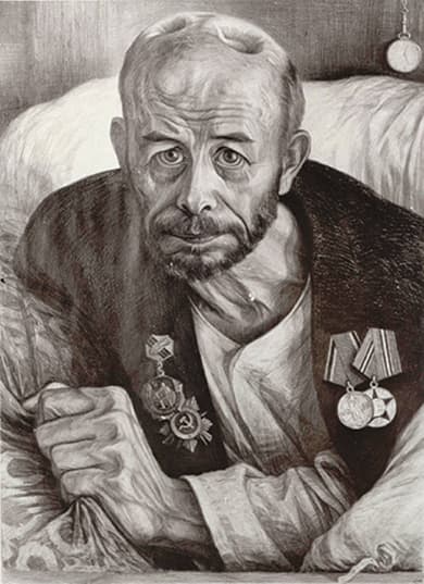Я сразу пошёл рисовать. Пришёл в первую большую палату, которую мне показал директор. Иду по палате, с двух сторон стоят койки, проход, опять койки. С правой стороны расположены окна, дальше глухая стена, а тут двери. И лежат эти инвалиды. Тишина, тихо. А за окном – лето в разгаре (начало июня). Окна открыты, сирень цветёт, солнце пробивается. Я иду, иду, до конца почти дошёл. Вижу – сидит в кровати молодой мужчина, совсем-совсем молодой. Он опёрся на столик, который перед ним, подушки тут у него. А голова – я смотрю – пробита пулей навылет. И не то что маленькое какое-то отверстие, а как бы насквозь пробит череп, то есть зияли две дыры, затянутые кожей. И с этими двумя отверстиями на самом видном месте он жил.