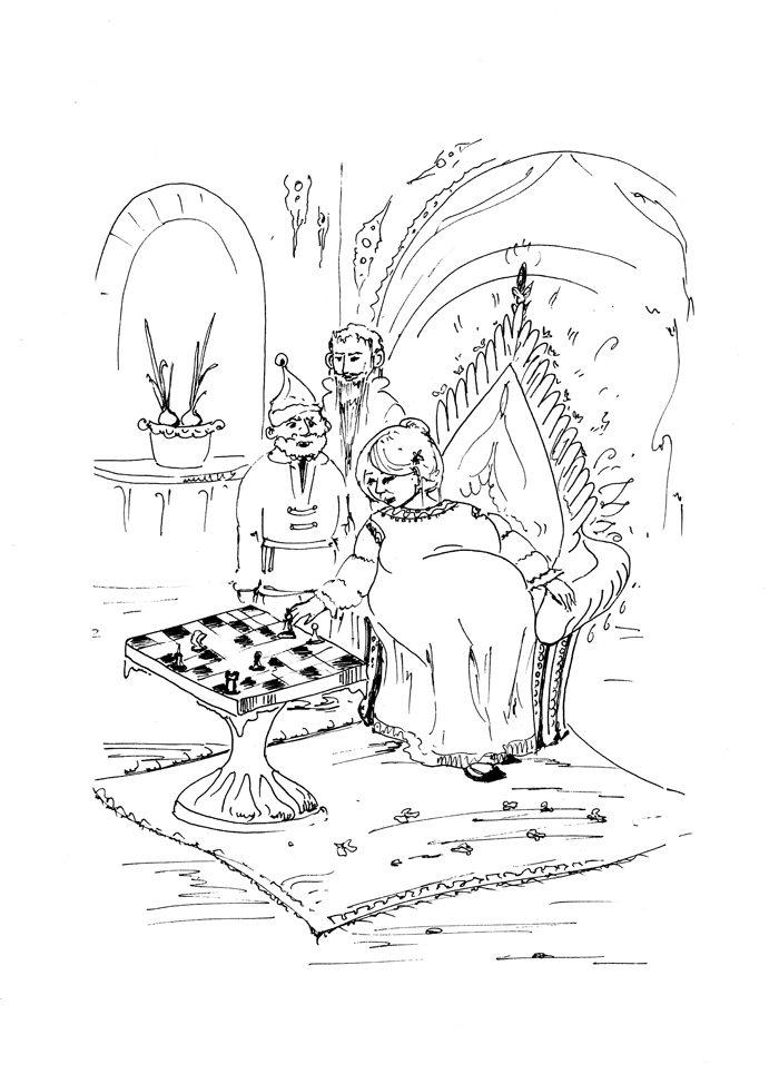 Возле царицы стоят трое мудрецов, советчиков по игре. Агрепина сделала знак Милычу и Веселку – помогайте! Агрепина сидела напротив Мамки и играла в шахматы. Остальных братьев разместили в другой стороне зала.