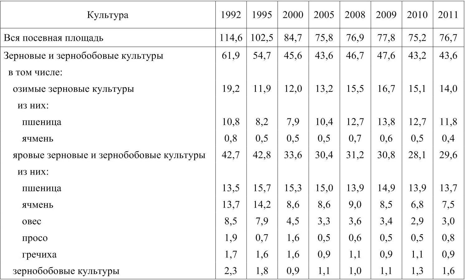 В 1992 году зерновые и зернобобовые культуры занимали площадь 61,9 млн. га, к 1995 году она сократилась до 54,7 млн. га. С 2000 года значительно уменьшилась площадь посева яровых зерновых культур (33,6 млн. га) при 42,7 млн. га в 1992 году.