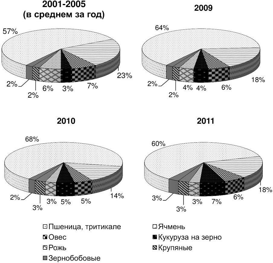Анализ приведенных на рисунке 1 данных показывает, что в среднем за год в 2001-2005 гг. объем производства зерна пшеницы и тритикале составил 57 % от общего валового сбора 78,8 млн. т, в 2009 – 64, в 2010 – 68 % и уменьшился в 2011 году до 60 % в связи с экстремально засушливыми условиями 2010 года, когда валовый сбор зерна составил 61 млн. т. Среди других зерновых культур ячмень занимает второе место в структуре производства зерна: 2001-2005 гг. – 23 %, 2009 – 18, 2010 – 14 и 2011 г. – 18 %.