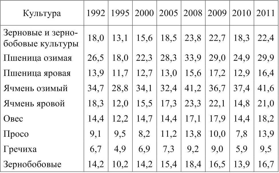 Самый низкий урожай зерновых и зернобобовых культур в РФ наблюдался в 1995 году – 13,1 ц с 1 га. Сельскохозяйственные предприятия всех категорий получили выше 20 ц с 1 га в 2008 году – 23,8 ц с 1 га, в 2009 – 22,7 и в 2011 году – 22,4 ц с 1 га. Наиболее высокая урожайность зерна получена за 20 лет по озимому ячменю – 28,8-41,6 ц с 1 га, и основной зерновой культуре – озимой пшенице от 18,0 ц с 1 га до 33,9 ц с 1 га. За все анализируемые годы урожай ярового ячменя был несколько ниже озимой пшеницы, но выше чем яровой пшеницы.
