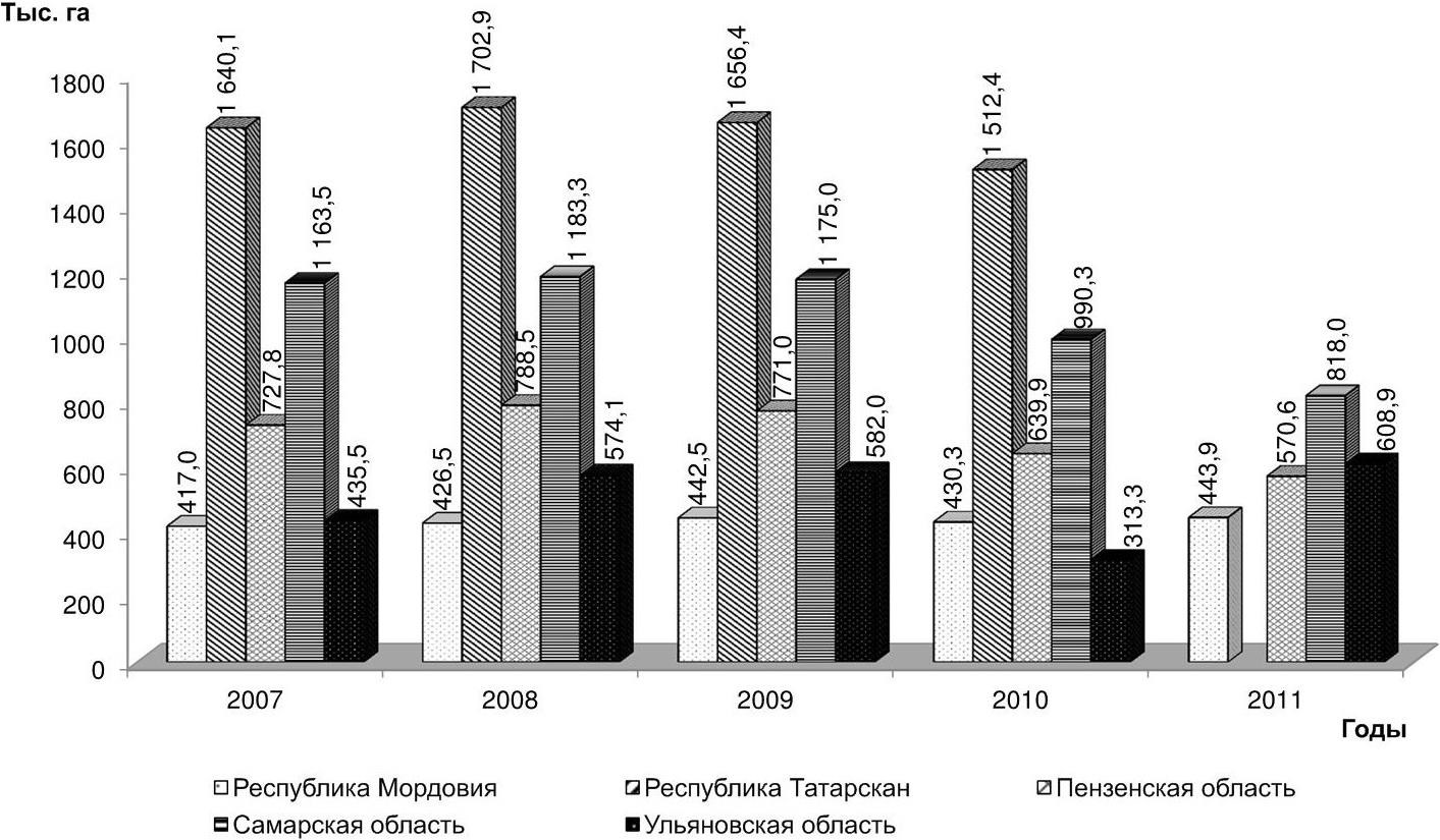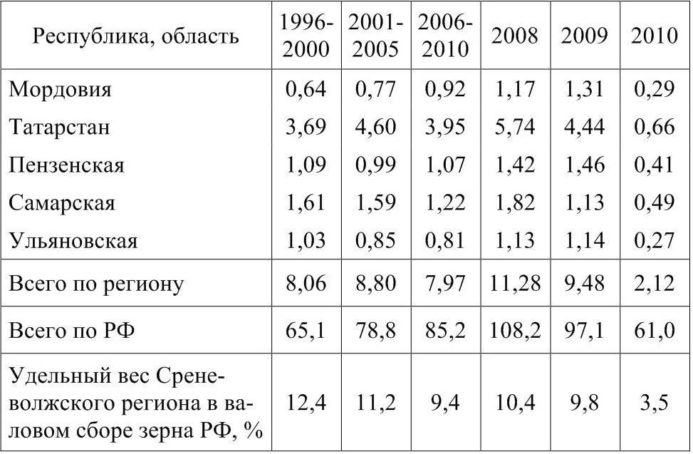 Зерновые и зернобобовые культуры в Средневолжском регионе занимали площадь около 4,4 млн. га в 2007 году, 4,6-4,7 млн. в 2008-2009 гг. и 3,9 млн. га в 2010 году.