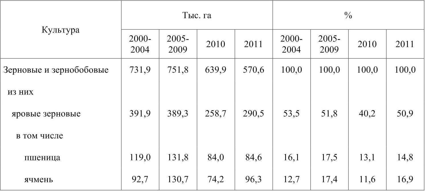 Структура посевов и валового сбора зерновых культур изменилась в неблагоприятную сторону: в ней уменьшился удельный вес дефицитных видов зерна – высококачественных пшениц, зернобобовых культур. В целом возросла доля продовольственной группы и снизилась фуражной, на что определенное влияние оказали экономические факторы, и прежде всего цены, которые в большей степени стимулировали производство продовольственного зерна, чем фуражного. Следует отметить, что при сокращении валового сбора зерновых культур проявилась тенденция увеличения в нем доли зерна озимой и яровой пшеницы. Особенно сократились посевные площади и валовые сборы овса, ярового ячменя, проса, гречихи и зернобобовых культур.