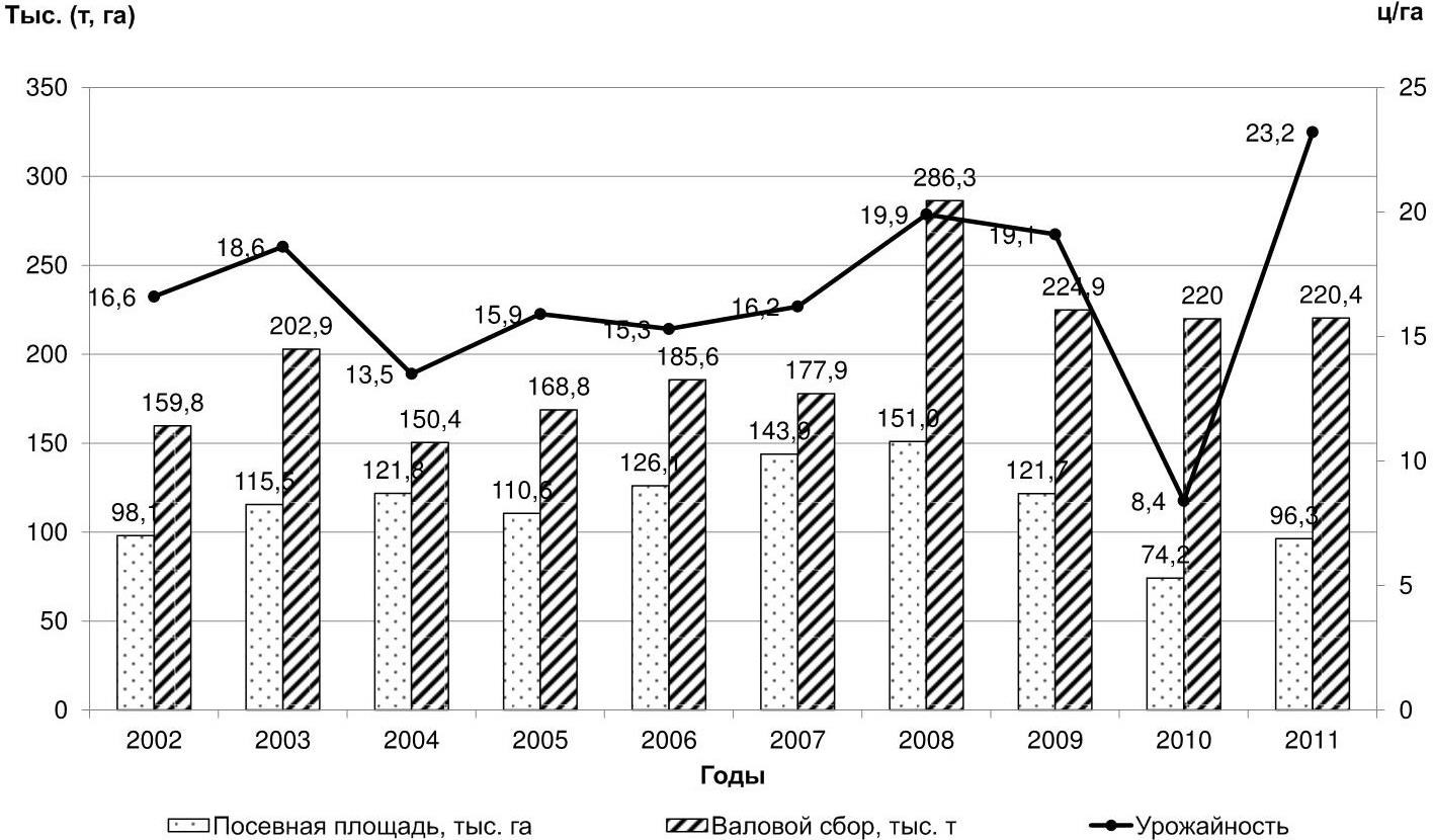 Валовой сбор зерна ячменя за последние 10 лет находился в пределах от 159,8 тыс. т (2002 г.) до 286,3 тыс. т (2008 г.), исключая 2010 г., когда общий сбор зерна составил всего лишь 22 тыс. т.