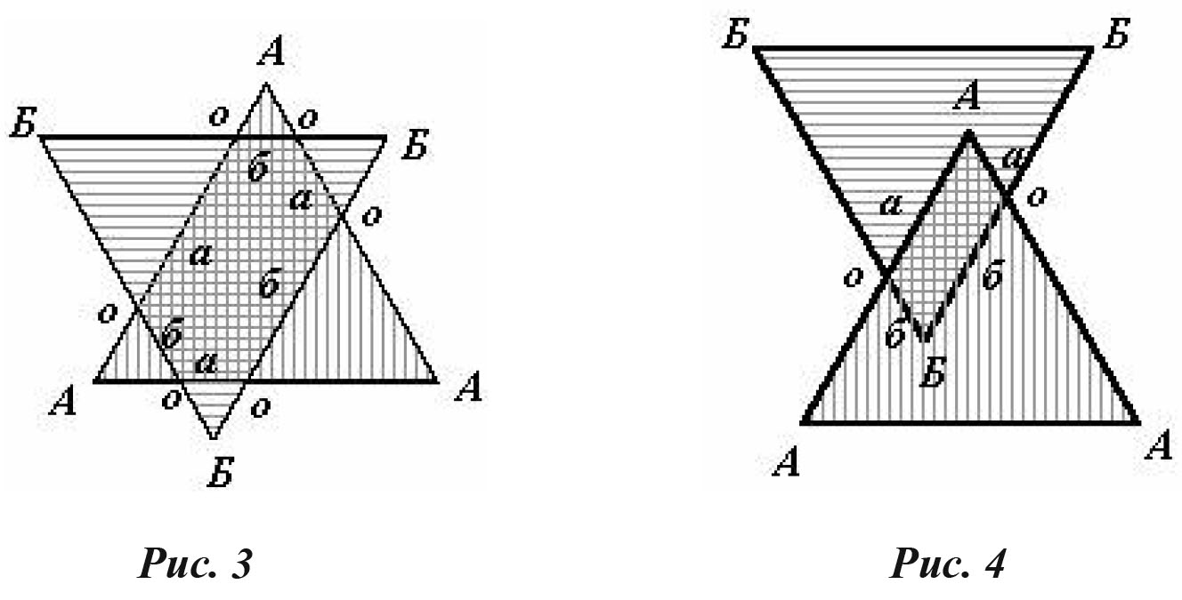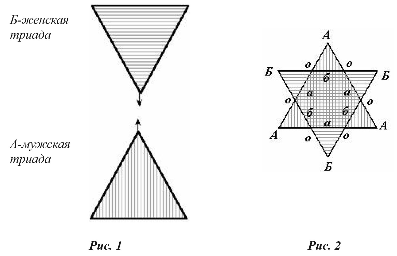 Получается этот знак в результате сближения двух равносторонних треугольников – А и Б (рис. 1), символизирующих мужскую и женскую триады соответственно, а затем и «врастания» их друг в друга до образования правильной шестилучевой звезды (рис. 2).