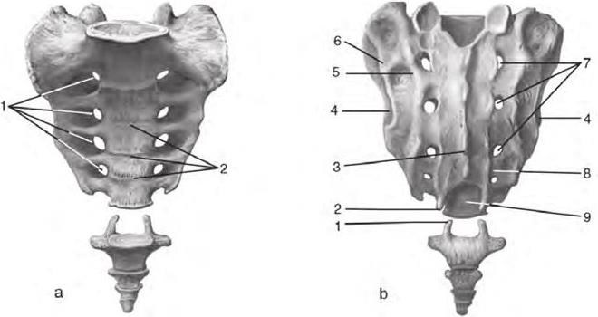 a – anterior aspect: 1 – anterior sacral foramina (foramina sacralia anteriora); 2 – transverse lines (lineae transversae)