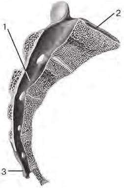 The sacrum, os sacrum (SI– SV), consists of five sacral vertebrae, vertebrae sacrales, which fuse to form a single bone in adults. Two parts and two surfaces are distinguished in the sacrum: the upper wide part, which is the base of the sacrum, basis ossis sacri; the lower part, which is the apex of the sacrum, apex ossis sacri; the anterior (concave) surface, which is the pelvic surface, facies pelviсa; the posterior surface (convex, rough), which is the dorsal surface, facies dorsalis (fig. 2.6).