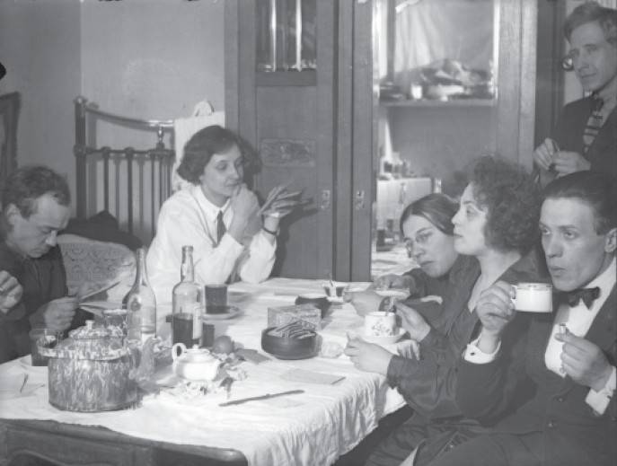 Е.И. Журавлева (вторая слева) и Д.И. Журавлев (крайний справа вверху) среди друзей-студентов. Москва, 1920-е годы