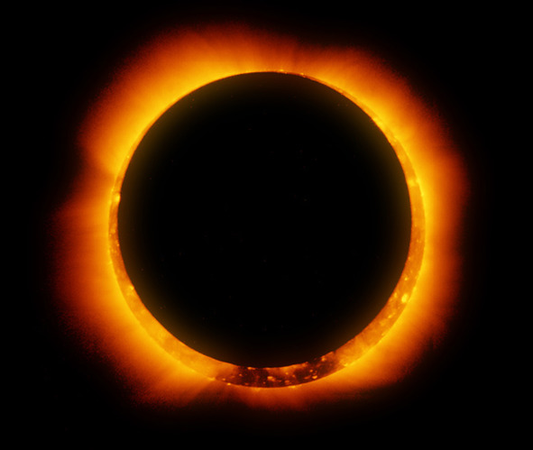 Рис. Р.X.1 Кольцеобразное затмение Солнца Луной. Хорошо видна Солнечная корона с протуберанцами, структура поверхности Солнца, которую Данте уподобляет вынутому из огня железному пруту, солнечные пятна. Луна ясно видна сплошным телом, о какой либо «скважности» Луны нет и речи. Кольцеобразное затмение происходит, когда Луна находится на наибольшем расстоянии от Земли, при этом её видимый размер меньше видимого размера Солнца.