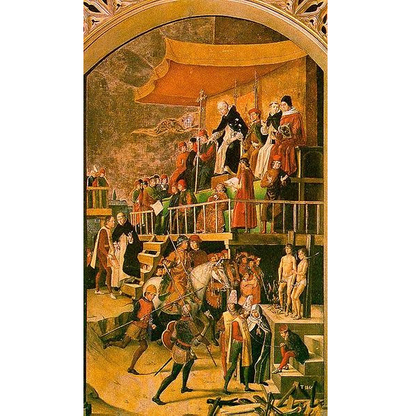 Р.X.3 Святой Доминик, руководящий аутодафе. Фреска Педро Беругете (1450—1504 годы). В руке Святого Доминика розарий-чётки, неотъемлемый его признак. Орудия пытки – столбы с вбитым между ног штырём (осуждённый должен не повеситься, а сгореть). Руки осужденных свободны. Дров немного, что продлевает зрелище. Внизу стоят очередные жертвы под охраной конных и пеших воинов, им предлагает крест священник, они отворачиваются. Трибуны для церковного клира и зрителей намного выше места казни.