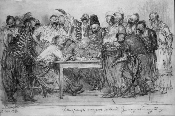 Рис. 3. И. Е. Репин. Эскиз к картине «Запорожцы пишут письмо турецкому султану», 1878. Бумага, графитный карандаш. 20,2x29,8 см. Государственная Третьяковская галерея, Москва