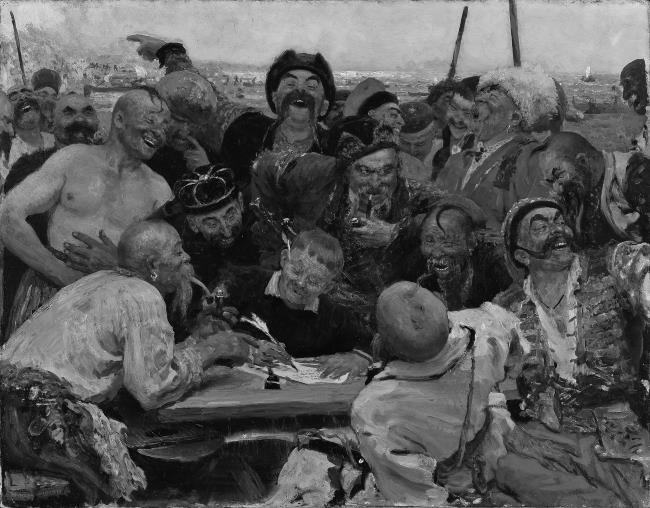 Рис. 1. И. Е. Репин. «Запорожцы пишут письмо турецкому султану», 1880–1891. Холст, масло. 203x358 см. Государственный Русский музей, Санкт-Петербург