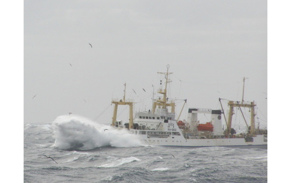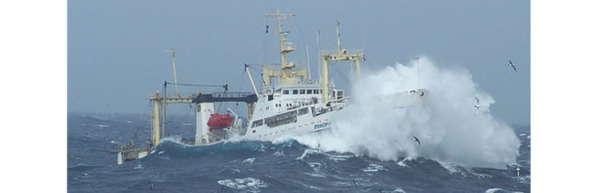 Уважаемые читатели! Для непосвящённых хочу пояснить, что на фото Вы видите промысловое судно, которое занято ловом рыбы. Оно оповестило всех нас об этом, подняв на правом ноке рея средней мачты сигнал – «Иду с тралом» (это два конуса вершинами вместе). Эти волны, которые разбиваются о форштевень судна, рыбаков абсолютно не тревожат. Был бы силён главный двигатель, чтобы иметь достаточную скорость траления. А остальное всё не важно. Так что для кого-то это романтика, а для рыбаков – обычный рабочий день.