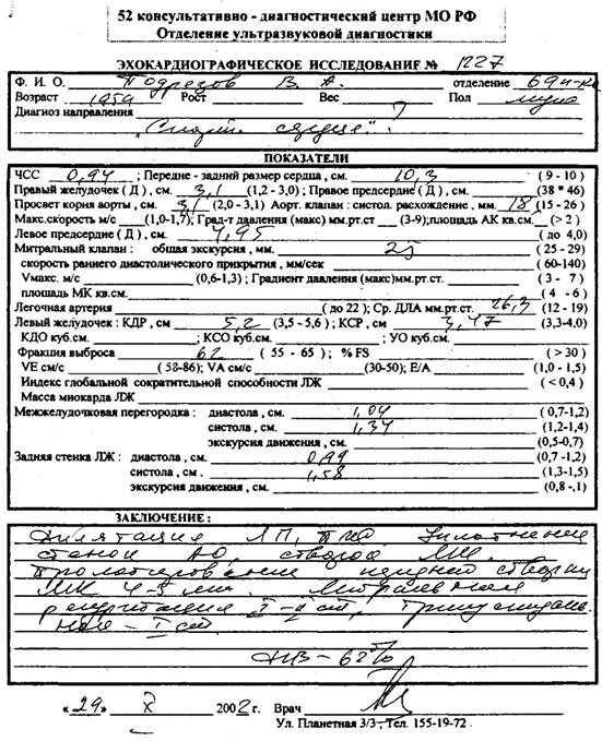 Эпизод первый, правда, растянувшийся на годы. Выше уже упомянул, что в сорок лет впервые столкнулся с «сердечной» проблемой, в результате чего попал в госпиталь, а именно – в кардиологическое отделение филиала госпиталя имени Мандрыка, находящегося поблизости от места моего проживания и службы. Но там ничего серьёзного у меня не обнаружили (рис. 3), чему, собственно, и я, и жена несказанно были рады. Затем прошло почти три года, причём достаточно напряжённых, поскольку на них выпали завершение подготовки и защита моей докторской диссертации. В общем, на моей кардиограмме, сделанной осенью в период ежегодной плановой диспансеризации, обнаружились существенные нарушения. Эхограмма, снятая затем в Московском центральном диагностическом центре, куда меня направили на консультацию, лишь усугубила создавшееся положение (рис. 4). Врач, зафиксировавший наличие митрального порока сердца, делятацию левого желудочка и другие отклонения от нормы, посетовал, что пришёл я к нему слишком поздно: «А надо было бы ещё лет пять назад… Так что ничего уже практически нельзя сделать, и признаки сердечной недостаточности: отдышка, отёки ног, боли за грудиной, – придут совсем скоро и неизбежно…». По результатам этой диагностики в начале 2003 года в плановом порядке был направлен в Центральный военный клинический госпиталь рода войск, в котором служил, располагавшийся тогда под Москвой в городе Одинцово. Там неприятные известия о моём здоровье только прибавились. На очередной эхограмме зафиксировали ещё и аорт-