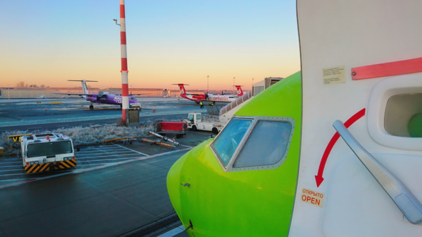 После того, как все формальности улажены, пассажиры рассажены и время слота для вылета получено, мы закрыли двери. Наш самолёт отбуксировали, мы запустили двигатели и начали движение в сторону ВПП 23 левой, но сначала заехали на площадку, отведённую для противообледенительной обработки, которая расположена недалёко от взлётного торца этой полосы. Одновременно на площадке могут обливаться несколько лайнеров, причём обработка производится с уже запущенными двигателями самолёта. Зарулил, облился специальной жидкостью, дорулил до ВПП, улетел. Красота!