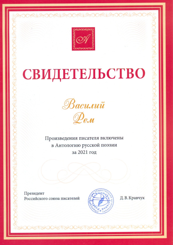 Стихи Василия Рем изданы в Антологии Русской поэзии 2021 год