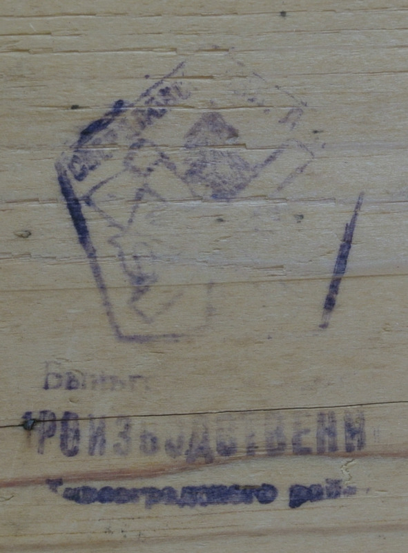 Клейм на быньговских сундуках сохранилось крайне мало. Одно из них – клеймо артели «Производственник» (ил. 1). Оно наносилось чернилами, имело пятиугольную форму. В нем изображалось дерево, перечеркнутое различными инструментами: пилой, топором и линейкой. Ниже пятиугольника наносилась надпись: «Свердлобллеспромсоюз», «Быньговская артель Производственник». Позднее, когда была создана мебельная фабрика, клеймо изменилось.