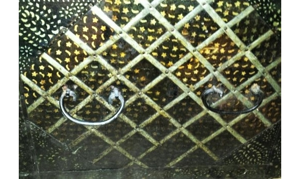 Он имеет значительные размеры47. Внешние поверхности, не исключая днище, обиты кожей (местами она истерлась) и гладкими железными полосами, расположенными «в клетку». На крышке и верхней стенке, внутри каждой «клетки», помещены просечные розетки со слюдой48 и подкладкой зеленого и красного цветов. В углах – просечные накладки в виде треугольников. В отличие от розеток, они имеют два вида, которые отличаются друг от друга орнаментом. Общее количество розеток: на верхней стенке – шесть, на крышке – восемь; число наугольников: по четыре на верхней стенке и крышке.