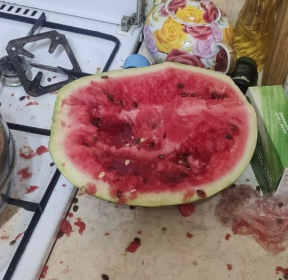 Он показал как боролся с арбузом, полоской шуршал и катался на пузе. То в лево то в право полоску трепал – так от арбуза он дом защищал. Он и подумать не мог, что арбуз, это не вор и не зверь а на вкус, Чувство Федота он притупил, в миг про бандитов Федот наш забыл