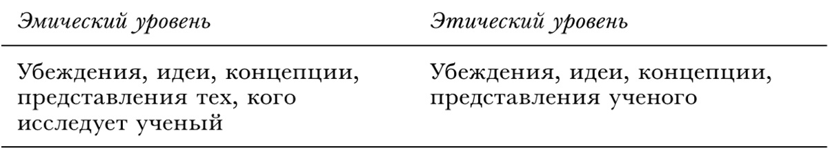 В каждом исследовании применяются какие-то методы; осознанно или нет, автор обязательно прибегает к их помощи для систематизации материала, его интерпретации и структурирования. В таком отношении ключевой для нашей книги стала идея двух уровней научного описания – эмического и этического, – впервые сформулированная Кеннетом Пайком в работе 1954 года «Language in Relation to a Unified Theory of the Structure of Human Behaviour». Термин «эмический» этимологически восходит к слову «фонэмический», которое происходит от греческого «phōnēma» – речь, звук. Согласно Пайку, эмическое имеет отношение к одному языку или одному диалекту. Термин «этический» не имеет смыслового отношения к этике, он выведен Пайком из «фонетики», раздела лингвистики, изучающего звуковое строение языка. Иными словами, этическое описывает обобщение, классификацию и систематизацию некоего набора данных, в то время как эмическое отвечает за описание одного конкретного элемента в системе. В антропологическом исследовании термины Пайка обрели несколько иной контекст. Под эмическим уровнем описания стали понимать изложение утверждений, терминологии и концепций так, как их используют те, кого исследует ученый. Тогда как этический уровень, напротив, предполагает изложение утверждений, терминологии и концепций самого исследователя. Принципиально важным здесь является проведение жесткой границы между двумя названными уровнями. Хотя впервые принцип деления был сформулирован для антропологических описаний, он полностью применим и в методологии метатеоретических исследований, а значит, подходит и для нашей работы. Еще раз для наглядности продемонстрируем деление этих уровней в форме таблицы, поскольку понимание его смысла важно для восприятия нашего текста.