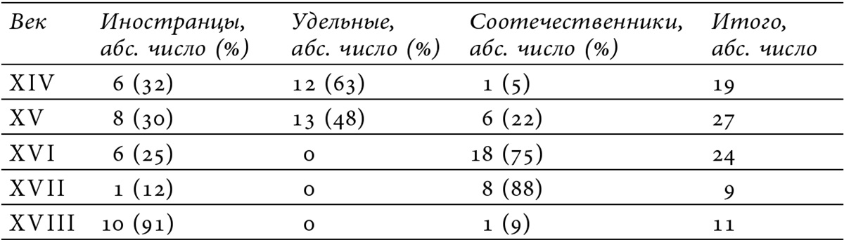 Более чем слом, выбор Василием III Соломонии установил «новый паттерн в свадебной политике». Согласно Коллманн, то был «первый раз, когда в жены Даниловичу предпочли избранницу из сравнительно невзрачного рода, а не из ведущей иностранной, удельной княжеской или боярской семьи»163. Эта мысль подтверждается статистическим анализом женитьб потомков Даниила Александровича, первого московского князя. На протяжении XIV, XV и XVI веков попеременно, в разных пропорциях и следуя разным трендам, использовались три источника невест, указанные Коллманн: «ведущая иностранная, удельная княжеская или боярская семья» (см. табл. 1.1)164. Безусловно, любимым источником невест и женихов для Даниловичей в XIV и XV веках были семьи удельных князей, затем иностранцев (особенно литовские Гедиминовичи), а на третьем месте – известные боярские кланы. В XVI веке браки с удельными княжнами полностью исчезли (вместе с самими удельными княжествами) и пустоту заполнил резкий скачок в количестве браков с русскими подданными.