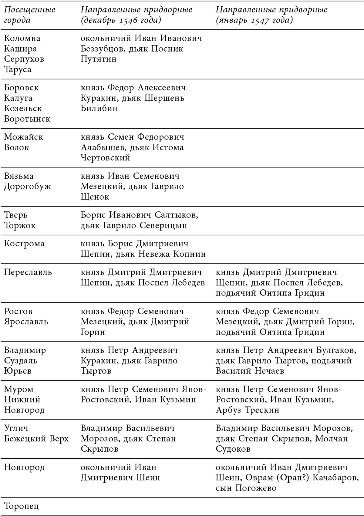 Прямые указания на поиск по всему царству присутствуют и в обширной канцелярской документации по поводу смотров невест в XVI веке. Два оригинальных канцелярских черновика содержат списки придворных, направленных далеко по всему царству в поисках кандидаток на смотр невест для первой женитьбы Ивана IV. Один черновик Владислав Дмитриевич Назаров датирует серединой декабря (12–18 числами) 1546 года, а другой – примерно 9 января (см. табл. 2.1)180. Эти списки, хоть и неполные, содержат имена 29 придворных, разделенных на 13 групп, которые были направлены в 27 региональных городов с целью начальной оценки невест для царя Ивана IV. Каждого придворного сопровождали дьяк и подьячий. Каждая такая делегация была назначена в 1–4 города – в зависимости, как полагают, от численности городского населения181. Например, окольничий Иван Иванович Беззубцев и дьяк Посник Путятин были направлены на юг от Москвы: в Коломну, Каширу, Серпухов и Тарусу182. Князь Петр Андреевич Булгаков и дьяк Гаврило Тыртов были направлены на восток: во Владимир, Суздаль и Юрьев183. Великий Новгород, Переславль и Кострома были, по всей видимости, довольно большими городами и заслужили отдельные делегации184.