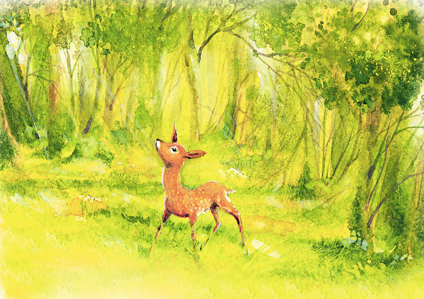 Он шёл позади своей матери по узкой тропинке, петлявшей среди кустарников. Как приятно было идти! Густая трава мягко щекотала ему бока. И повсюду были такие же дорожки, они разбегались по всему лесу. Мать знала их все и сразу находила место, где можно свободно пройти.