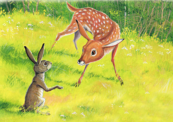 Дети всё ещё стояли и молча рассматривали друг друга. Вдруг Фалина сделала прыжок и умчалась. Бемби и Гобо бросились вдогонку. Они носились как угорелые по лугу и когда, запыхавшиеся, остановились, были уже друзьями.
